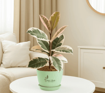 The glossy leaves of Rubber Plant come in shades of dark green, marked with yellow, pink, cream, white, or deep maroon.