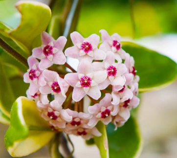 The trailing stems of hoya have clusters of aromatic waxy flowers. The plant is famous for its deep green, long-living, vining foliage and pink or red flowers.
